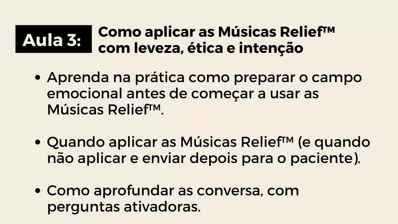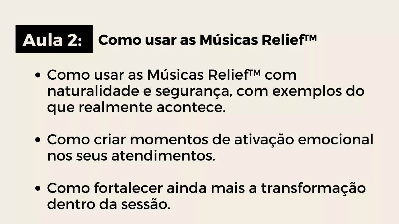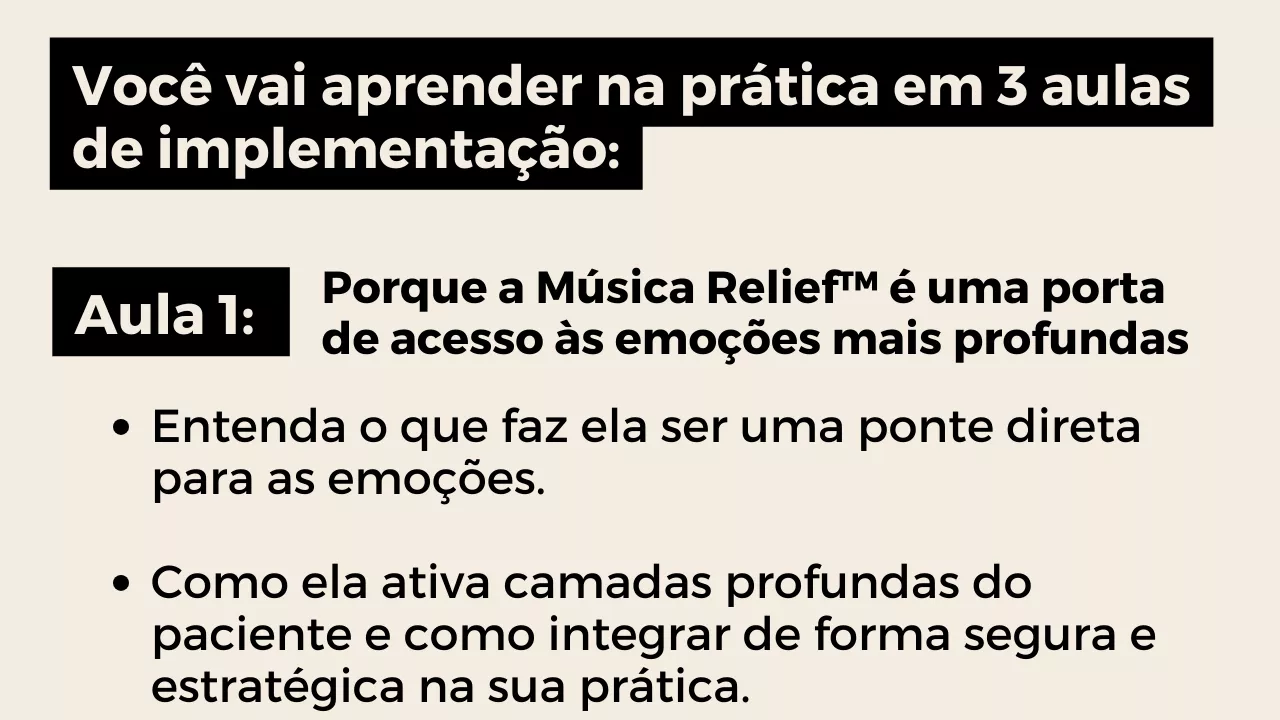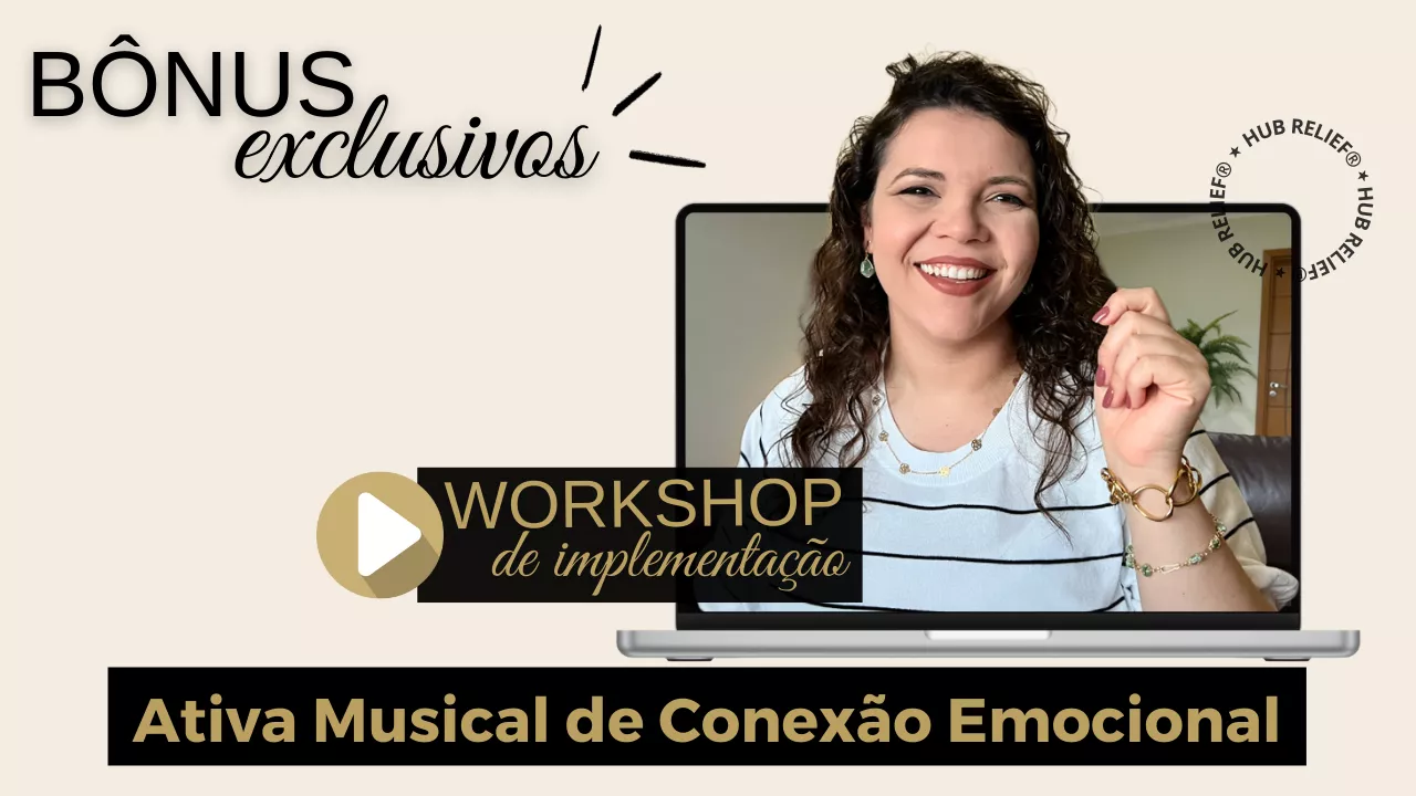 Workshop de Implementação: Ativa Musical de Conexão Emocional, com 3 aulas práticas com o essencial pra você usar as Músicas Relief com confiança — no seu jeito de atender, somando ao que você já faz bem.