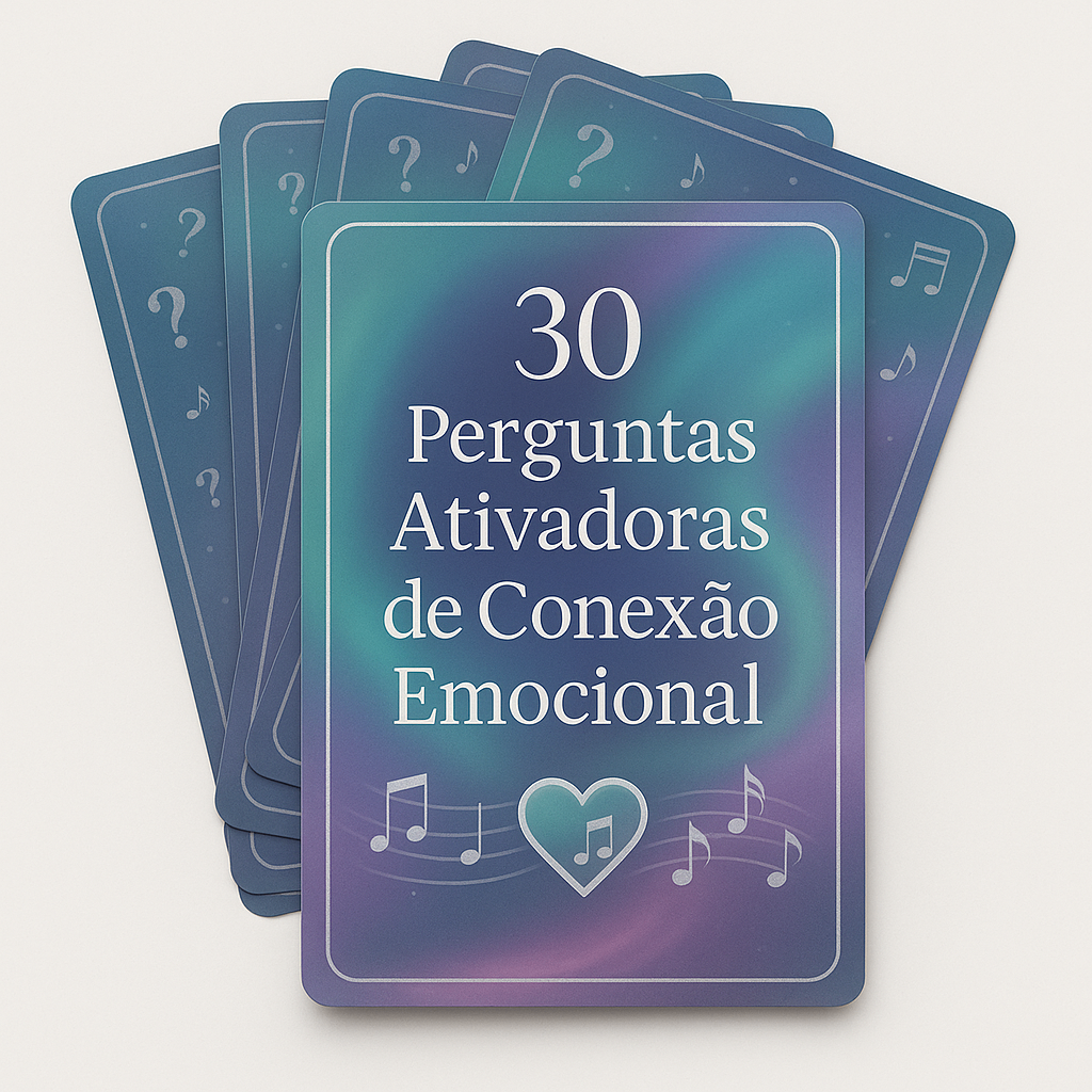 30 Perguntas Ativadoras de Conexão Emocional Um combo de perguntas diretas, delicadas e impactantes, selecionadas para destravar conversas, aprofundar o sentir e expandir o efeito das Músicas Relief nas sessões.