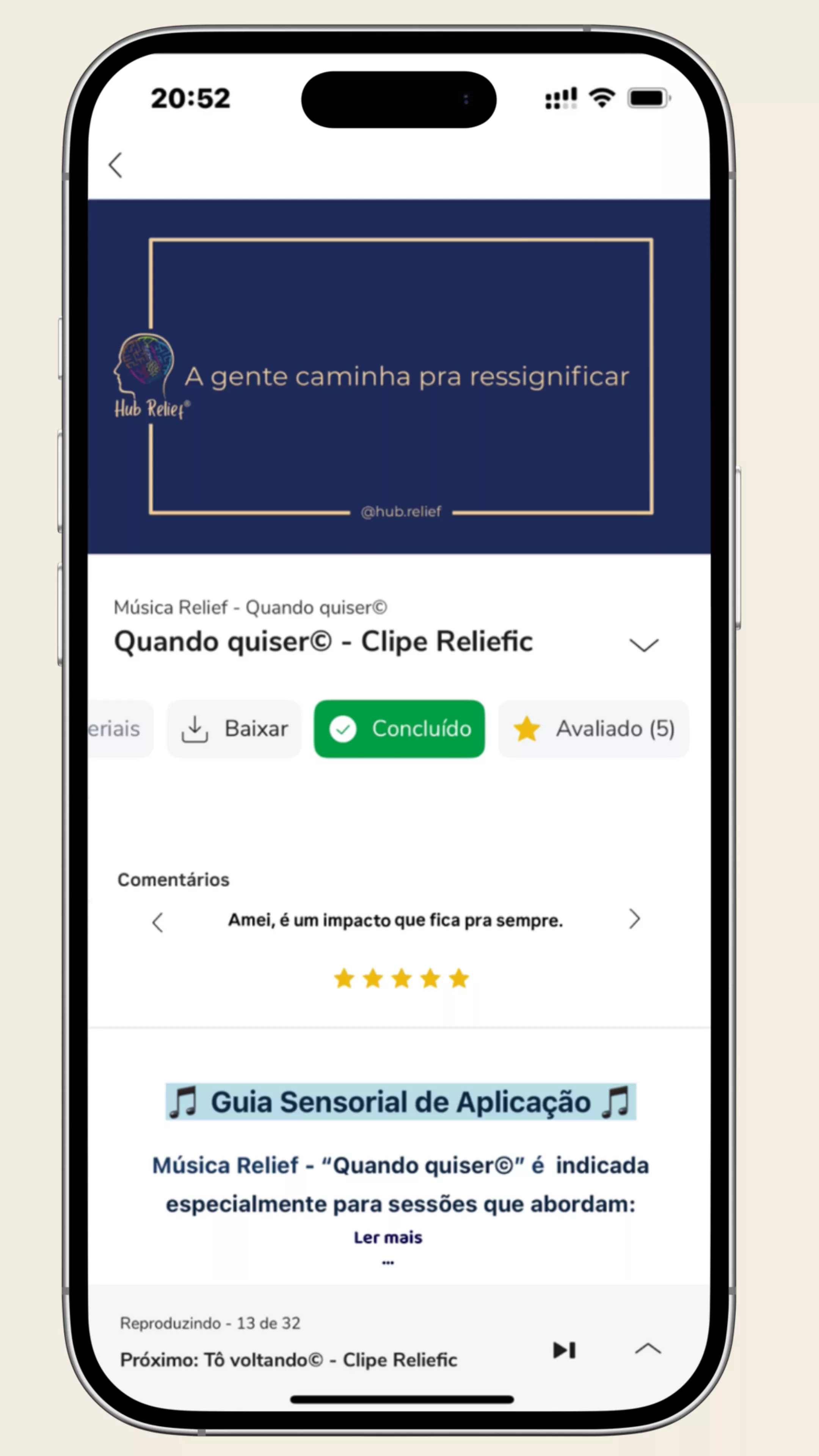 Cada Música Relief tem intenção e função emocional específica — criadas para potencializar ainda mais o impacto das sessões, abrindo espaço para mais conexão, mais presença e expressão emocional com mais profundidade.
